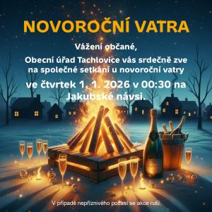 Vážení občané, Obecní úřad Tachlovice vás srdečně zve na společné setkání u novoroční vatry ve čtvrtek 1. 1. 2026 v 00:30 na Jakubské návsi.