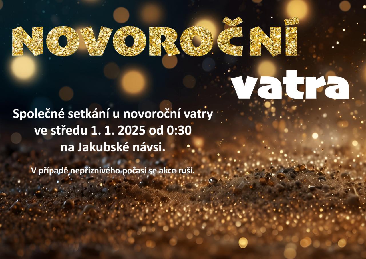 Společné setkání u novoroční vatry ve středu 1. 1. 2025 od 0:30 na Jakubské návsi. V případě nepříznivého počasí se akce ruší.