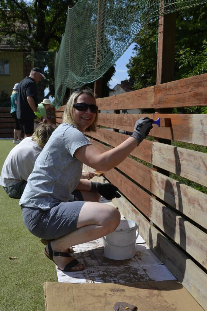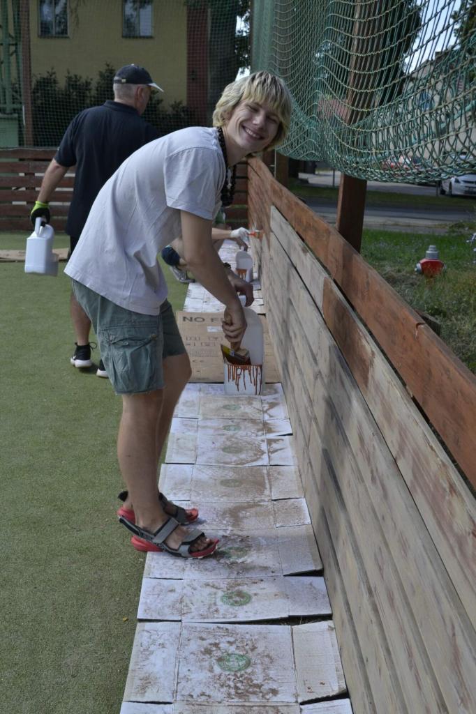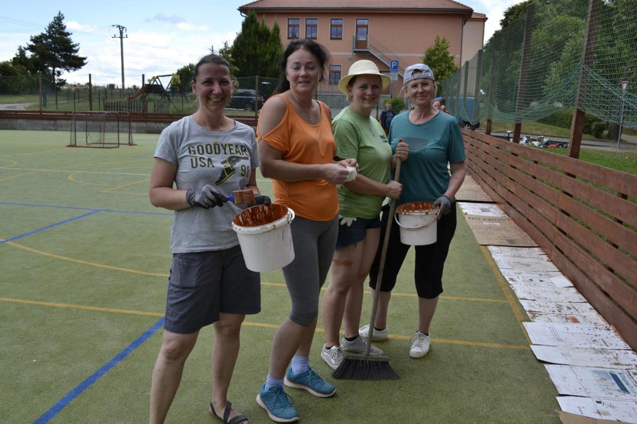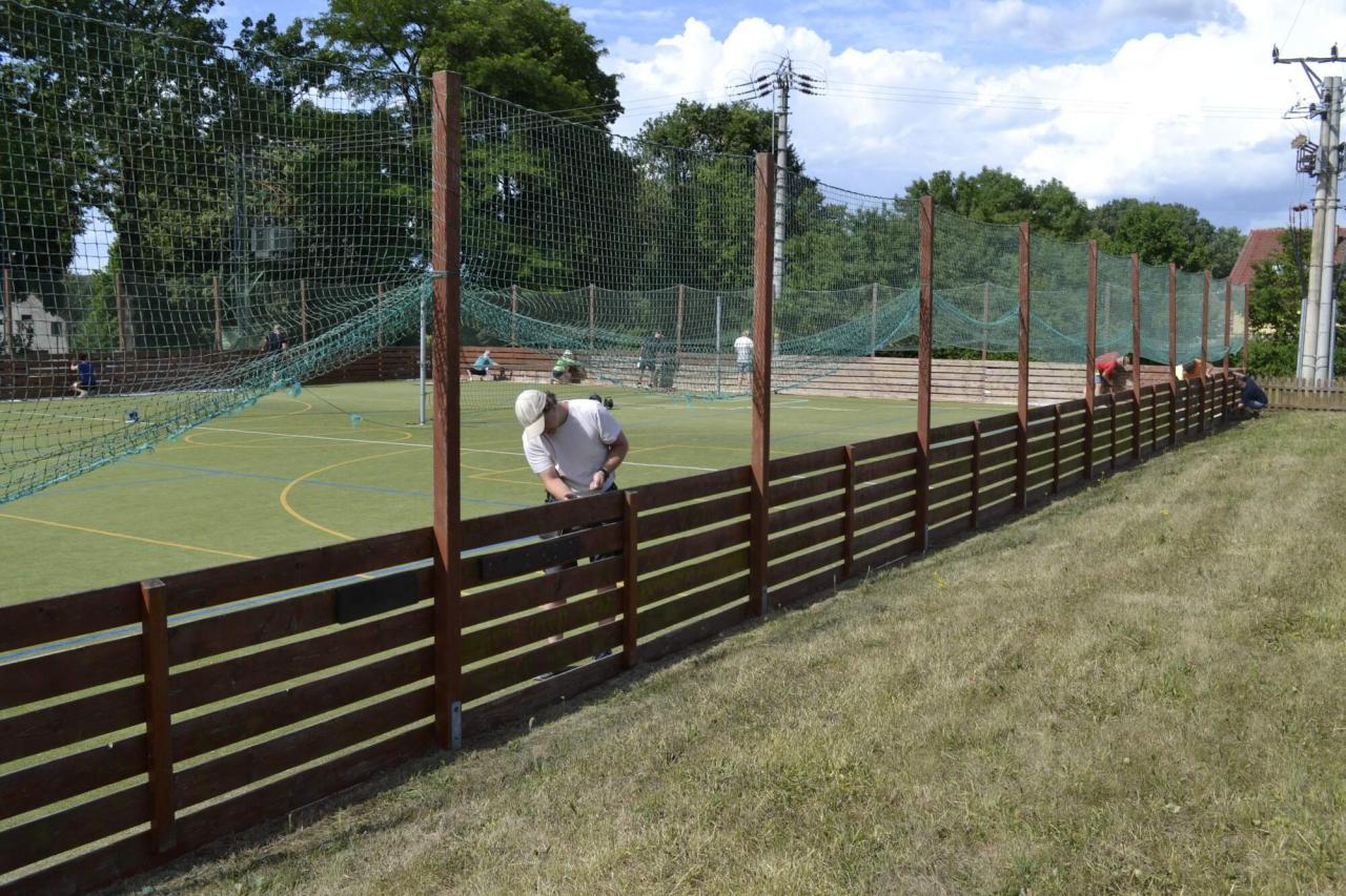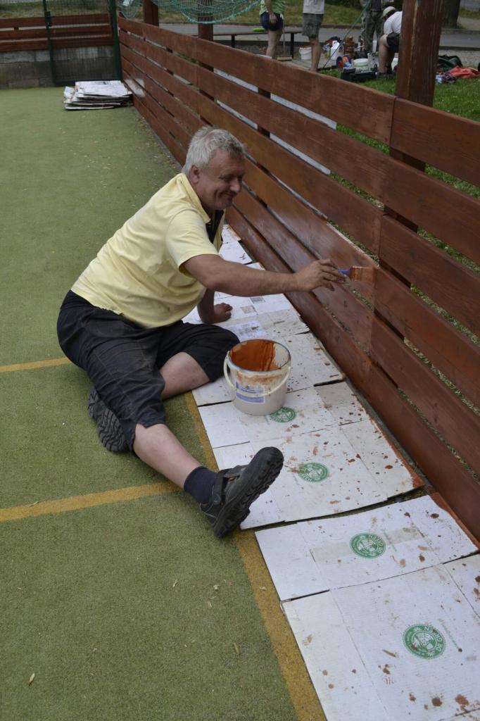 Členové spolku TOPAS a volejbalisté první středu v červenci obrousili a natřeli oplocení multifunkčního hřiště.