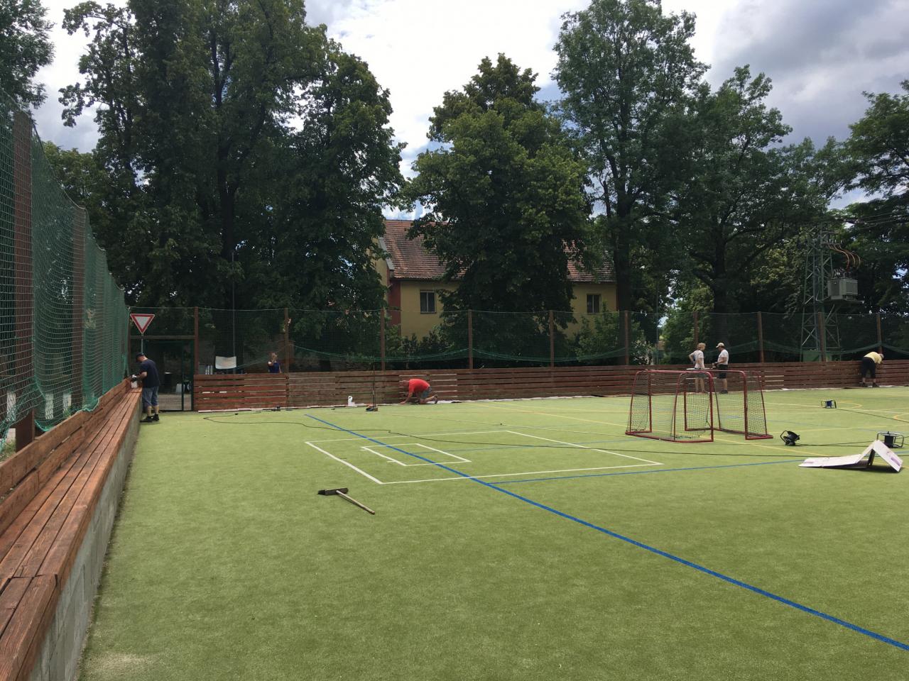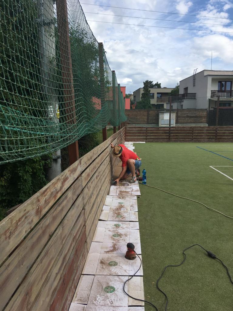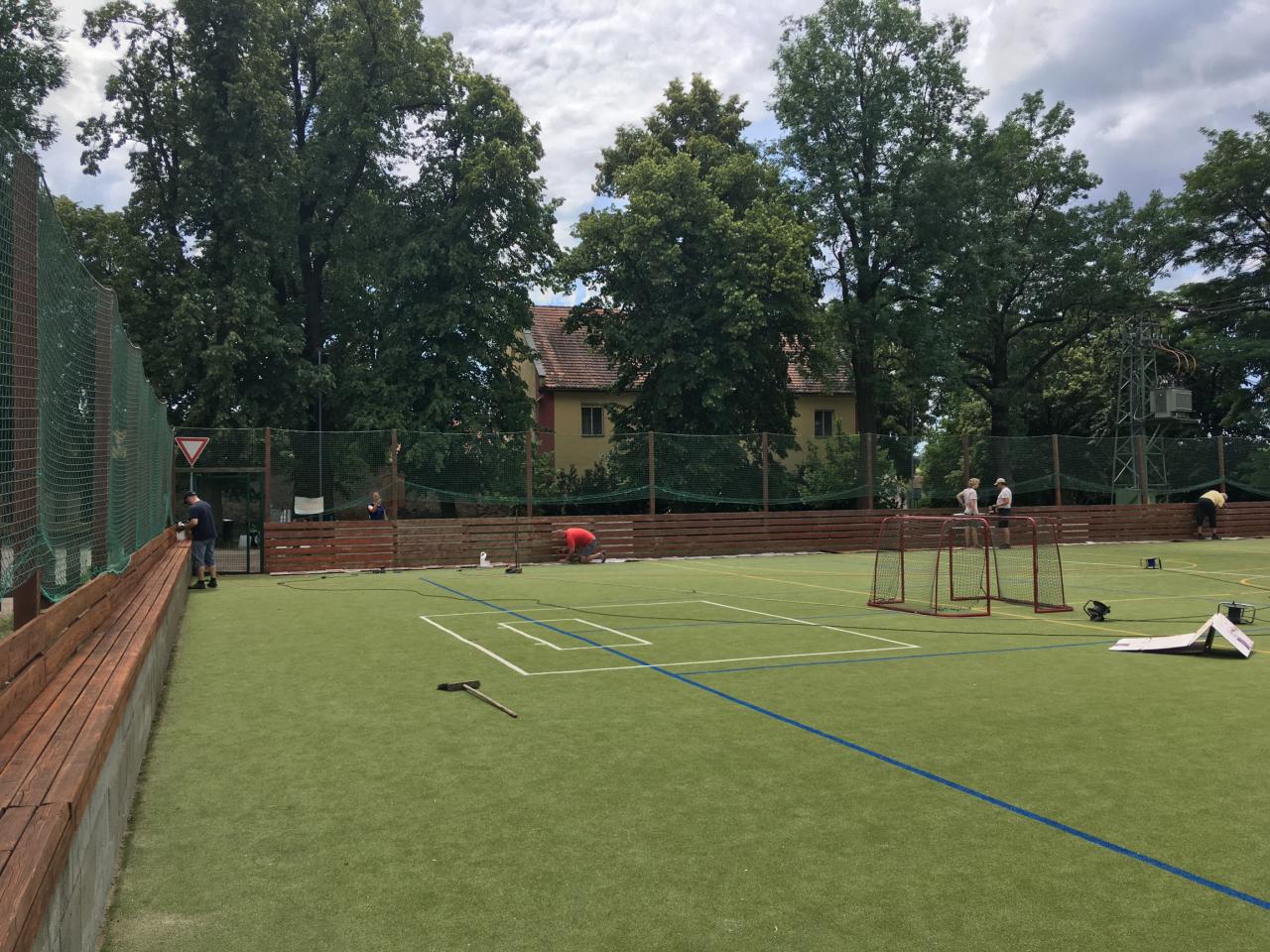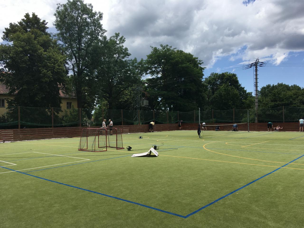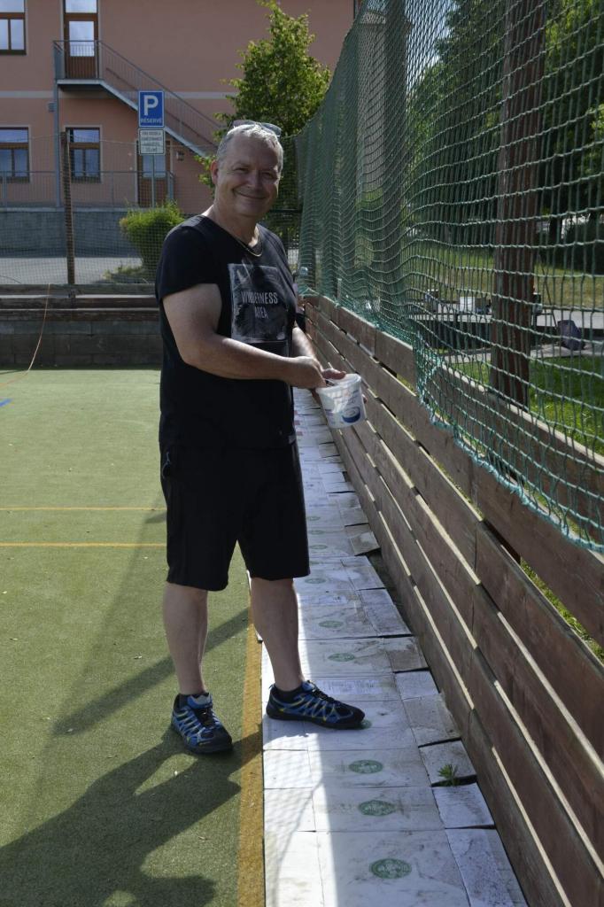 Členové spolku TOPAS a volejbalisté první středu v červenci obrousili a natřeli oplocení multifunkčního hřiště.