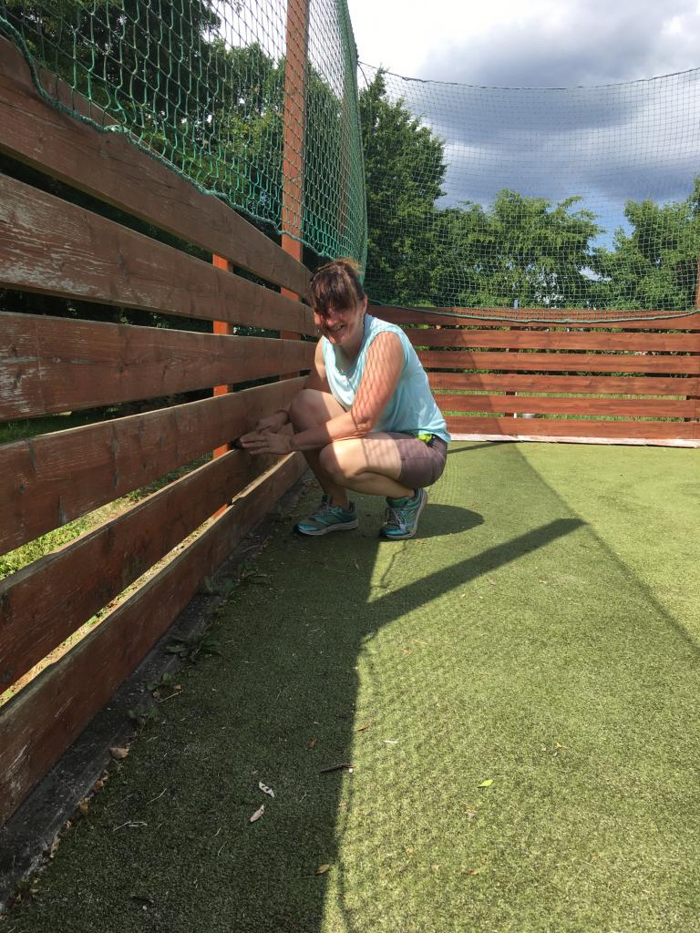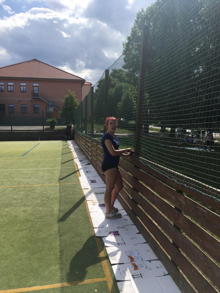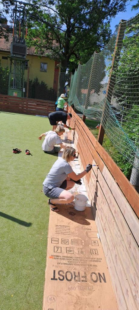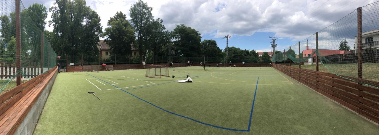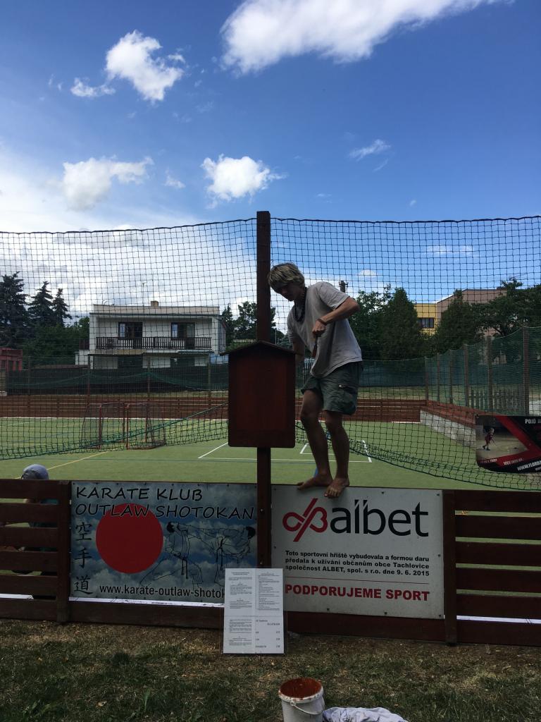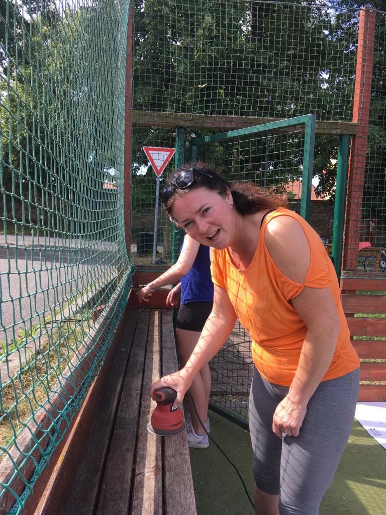 Členové spolku TOPAS a volejbalisté první středu v červenci obrousili a natřeli oplocení multifunkčního hřiště.